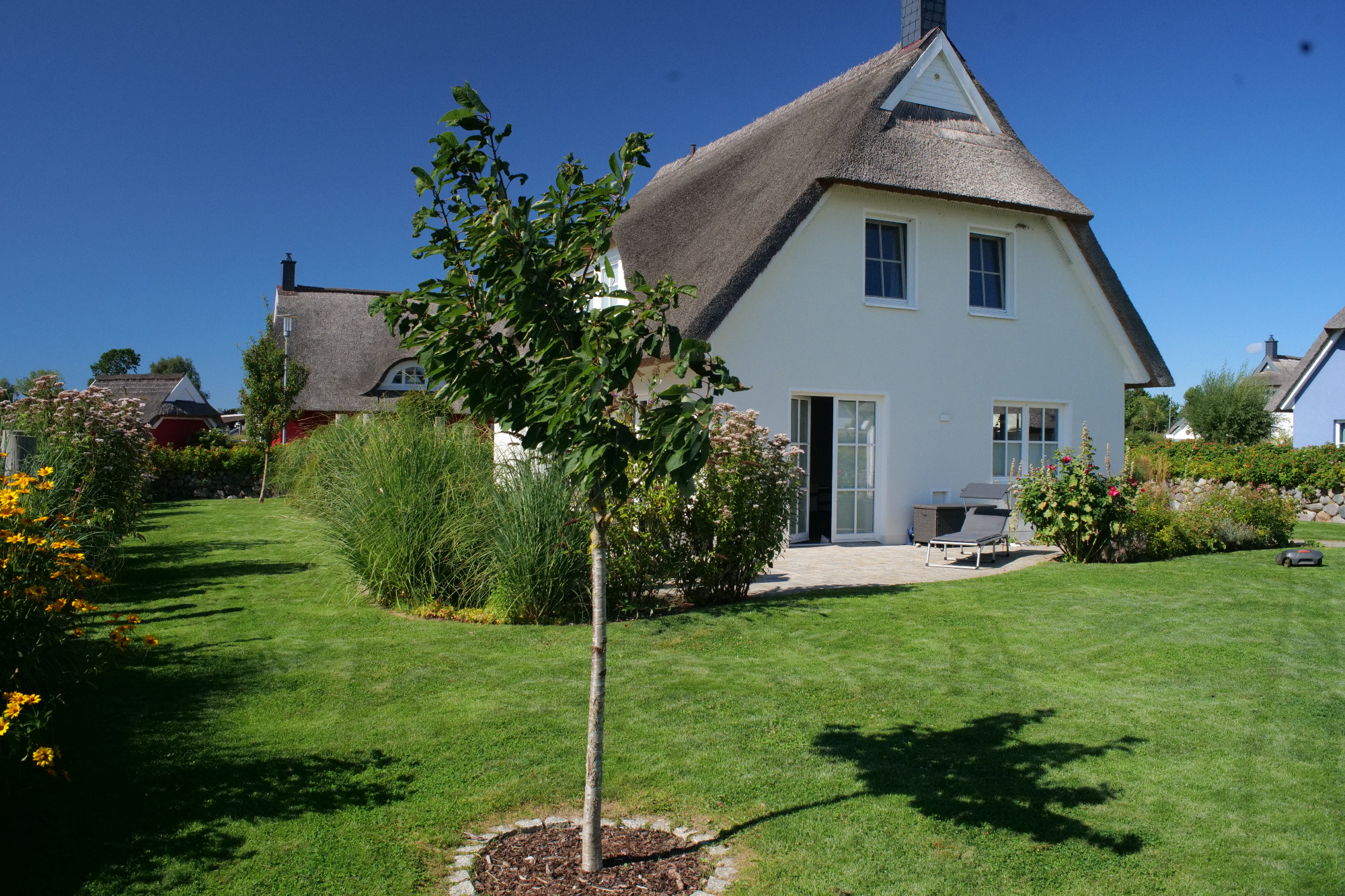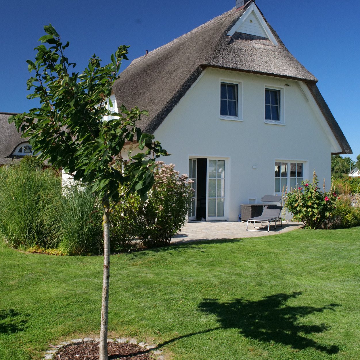Modernes, reetgedecktes Haus (BJ. 2020) in malerischer Lage zwischen Boddenlandschaft und Großstadt nördlich von Stralsund. Die Unterkunft bietet Platz für bis zu 8 Personen und ist ausgestattet mit einer Sauna, Kaminofen, einer Waschmaschine sowie kostenfreiem WLAN über einen Glasfaseranschluss. Die großzügige, voll ausgestattete Küche ermöglicht komfortables Kochen und Zusammenkunft. Der weitläufige Garten verfügt über eine großzügige Terrasse, ideal für entspannte Stunden im Freien. Des Weiteren steht eine Wallbox für E-Fahrzeuge zur Verfügung, und es sind drei PKW-Stellplätze inkludiert. Diese Unterkunft eignet sich hervorragend für Familien- und Gruppenreisen und ist dank des fußläufig erreichbaren, flachen Badestrandes auch für Kleinkinder bestens geeignet.